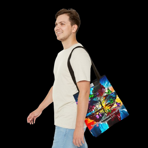 Let your faith flourish with this stunning Ephesians 3:17 All-Over Print Tote Bag, inspired by the deep truth of God's Word. Covered in rich, inspiring artwork and scripture, this bag features the powerful verse. Whether you're at Bible study, on the go, or having a quiet walk with Christ, this bag is a powerful reminder of where your strength comes from. Order yours today, and carry the truth in style.