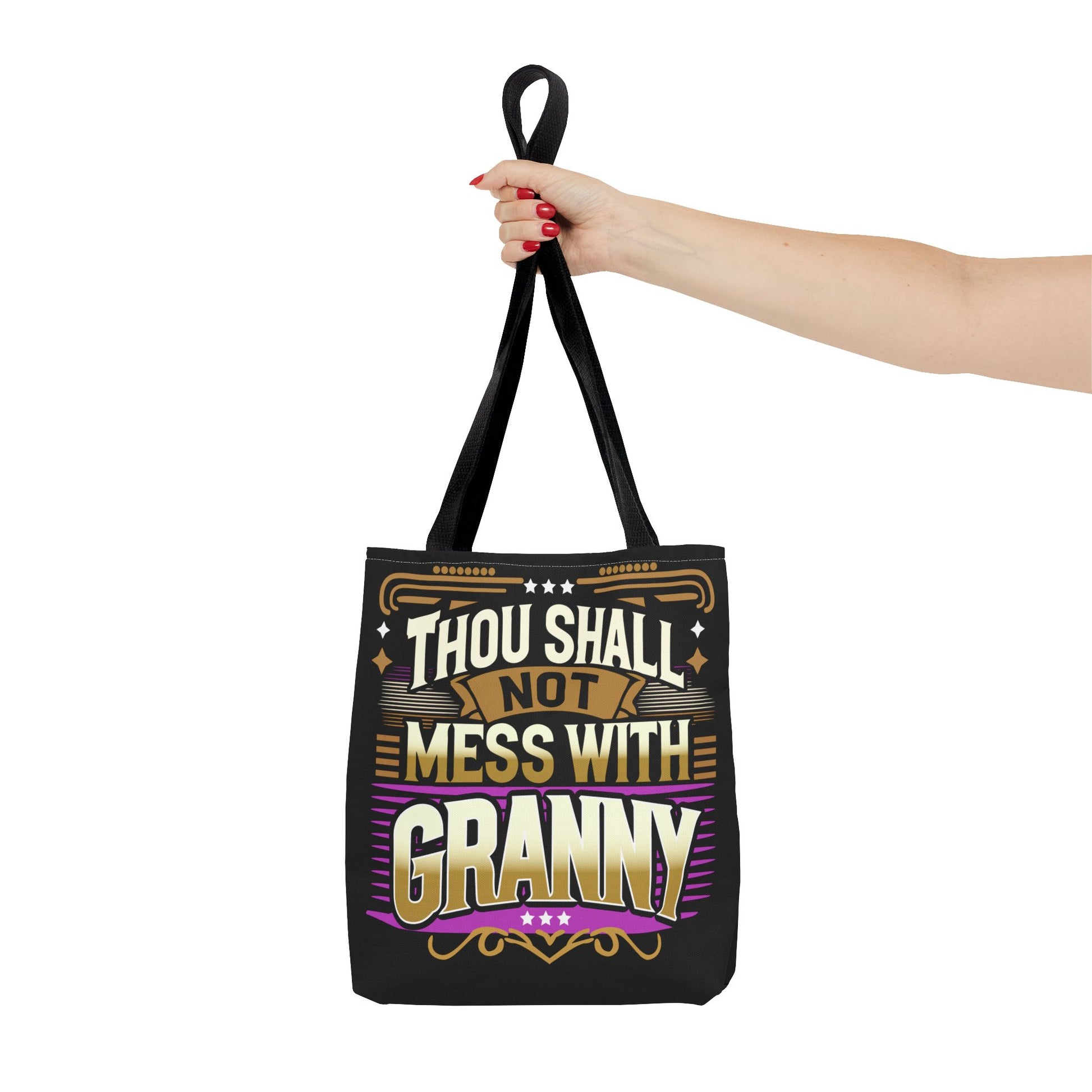 This sturdy tote brings a little attitude to everyday errands. The bold “Thou shall not mess with granny” line reads like a private wink—funny, protective, and lived-in. It wears easily over an arm or shoulder when you’re running to the market, ferrying library books, or folding into the passenger seat on the way to a craft fair. The roomy boxed corners and medium-weight polyester hold groceries, knitting projects, or a stack of mail without sagging. Reinforced handles and clean, matching seams mean it keeps its shape and keeps up with a busy rhythm. It’s the kind of bag that announces someone’s humor and no-nonsense care—grace with backbone.—a little laugh, a lot of usefulness.